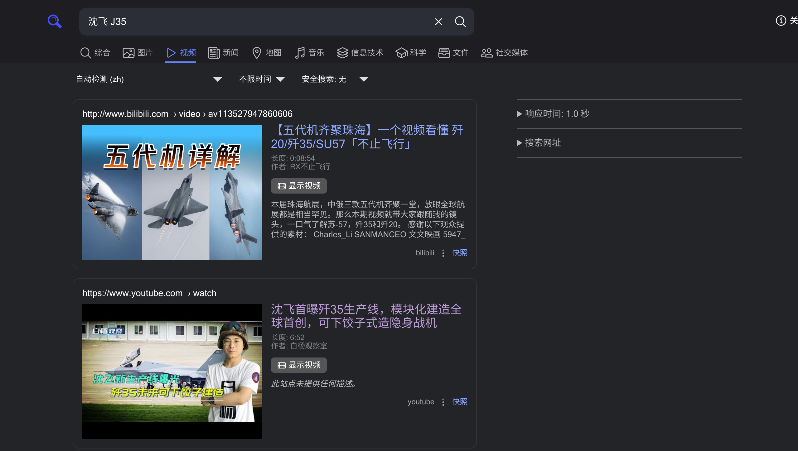 再比如,我想要搜索J35在Bilibili和YouTube上的相关视频,只需要在视频搜索中勾选Bilibili和YouTube,搜索结果返回如下: