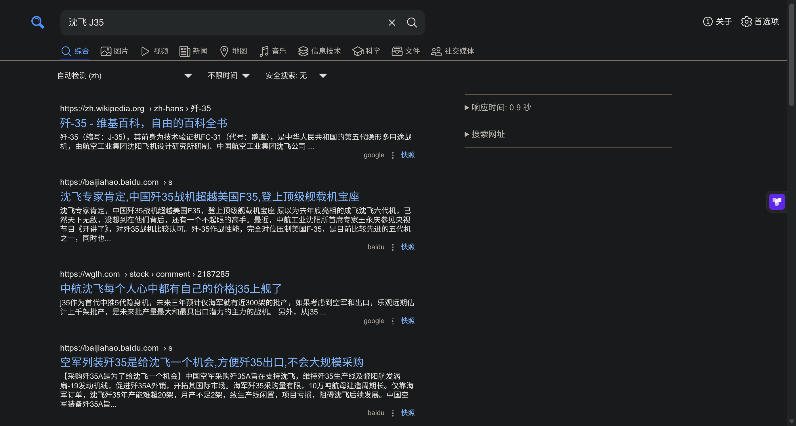 例如,如果我想从百度和Google上搜索我国国产第五代战斗机歼35的相关内容,只需要勾选Google和Baidu,搜索结果返回如下: