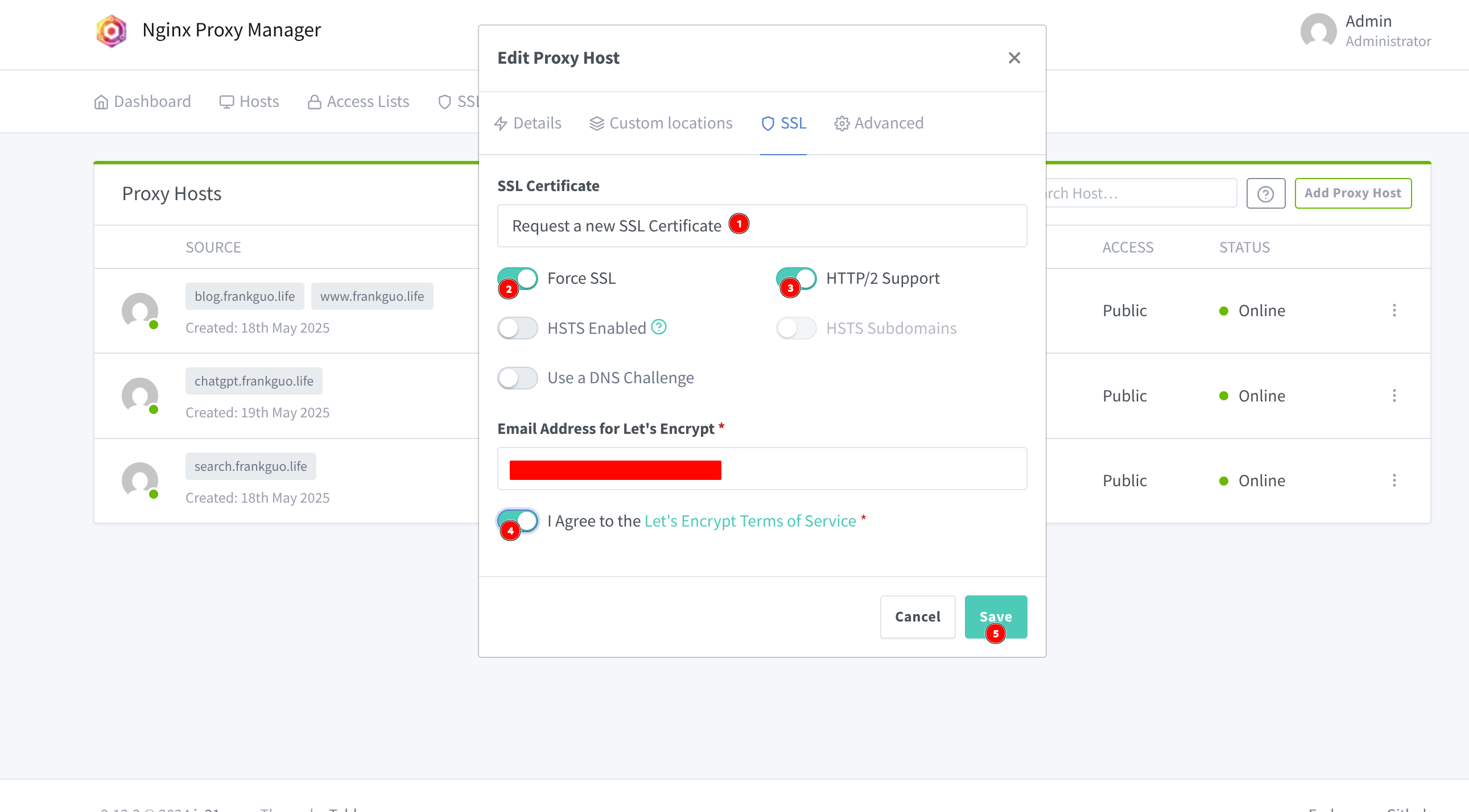 我在如何使用Halo搭建自己的个人博客(小白详细版)这篇文章已经详细介绍过Nginx proxy manager,这里直接给出配置信息,在CloudFlare添加一条DNS解析记录,然后在proxy manager里面进行反向代理,并配置SSL证书: